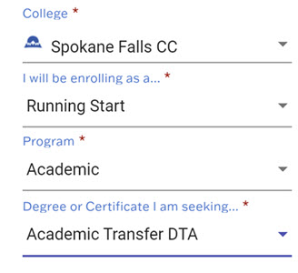 To enroll in Running Start @ SFCC, whether it’s just for a few classes or to attend full time, you must complete the statewide community college application. On your application, choose the options shown in the oposite image.